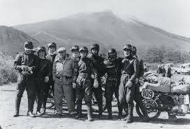 Both appeared even more demanding than he had heard. His first sight of the assembled Grand Prix machines from all those different countries also overwhelmed Honda. He examined them in minute detail, squatting down in his usual way. A famous race, whose name still lives in Japanese motorcycle racing history, began up in the Asama highlands in 1955. It is officially called the All Japan Motorcycle Endurance Road Race. Generally held every other year, the first race in 1955 was named the Asama Highland Race, and the second and third races in 1957 and 1959 were called the Mount Asama Volcano Race. Honda continued to taste bitter defeat in these competitions until the third, when it won an overwhelming victory. This photo shows Soichiro Honda (fourth from the left) posing with Honda riders as Mt. Asama looms in the background. The shock he received when the race began was even greater. Years later, a motor journalist named Shotaro Kobayashi asked him: "What made you happiest as an engineer?"