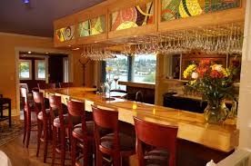 Interior Designer - Olympia WA I designed the room layout, color scheme, lighting plan, custom artwork, custom bar and furniture for this high-end award-winning (and very popular) Olympia wine bar. I worked with fabric artist, Janice Arnold, to design these curtains made from felt-infused silk to help soften the dining area and provide privacy for those customers that wanted it. The most spectacular view is from the large corner window area in the bar. I designed this under-lit bar with this glass mosaic to create an inviting place to gather with friends and enjoy the view. Custom glass mosaic by Jennifer Kuhns. They wanted an atmosphere in which people felt comfortable - either spending $100 on a bottle of wine or coming in right from work to enjoying a little happy hour before heading home. I feel the playful yet sophisticated design achieved that goal. Interior Design & Custom Art, Olympia Wa In collaboration with Red Door Interiors. The space was a multicolored playful space.