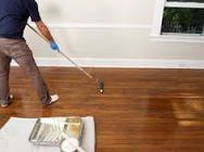 Use a brush to cut in around the room perimeter. Applying stain (as well as sealer and polyurethane) is done using many of the same techniques you’d use when painting. Always begin your stroke a foot or two away from the area you’ve just coated. Then brush (or push applicator) to meet the previously stained area. This will help ensure even coverage. Follow up application by rubbing off excess stain with a rag. The goal is an even tone across the entire floor surface, although slight variations are perfectly acceptable. Apply polyurethane in two- or three-foot-wide parallel rows, each row overlapping the previous one. Make smoothing strokes (uninterrupted, continuous runs with the roller using light, even pressure) after completing each row. Lightly sand between coats of polyurethane with very fine, 320-grit paper. A sanding pole makes it easier on your knees, but hand-sanding allows you to spot embedded debris. Wipe surface clean with a tack cloth or a rag dampened with mineral spirits before proceeding with the next coat.