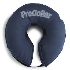 ProCollar Premium Inflatable Protective Collar Shop all by ProCollar The ProCollar is a great alternative to the traditional E-Collar, providing less stress for a quicker healing time! The ProCollar is very well tolerated by dogs and cats because it does not interfere with their vision. Pets wearing the ProCollar are able to eat, sleep and play at ease while staying protected. It is made of a vinyl inner bladder that is inflated through a two-way air valve, much like a beach ball. Once inflated, the size and thickness of the ProCollar function as a soft deterrent. The inner bladder is protected by a durable and comfortable canvas jacket to resist against bites and scratches. The ProCollar is held in place by inserting the pet's everyday collar through the ProCollar’s three inner rings. The Velcro strap should be placed at the back of the neck and then adjusted for a custom fit. For proper sizing, measure your pet's neck. For breeds with longer limbs or breeds in between sizes, always size up!