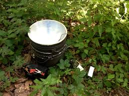 The vanes then fit tightly in a 10″ funnel held onto the 2 gallon bucket by shortened mini-bungees. Any UV bulb can then be dropped into the vane assembly (in this case a BioQuip light). The diameter of the vane opening at the bottom is slightly narrower than at the top, providing a very snug cavity for the bulb. Cardboard egg cartons or towel padding has to be added to the bucket to provide insect resting area. Cost: Bucket and vane assembly is $56.37. (w/o tax) – the standard 15w light from BioQuip it is $60.70. Total price is ~$117.The only limiting factor is the size of stacked buckets, about 12 traps require the same storage space as 2 rigid built traps. Vanes collapse to be negligible in size, the smaller 2 gallon buckets are better suited to a less-abundant fauna but can be upgraded to 3 1/2 or 5 gallon sizes for appropriate areas (mounting the funnel onto a lid of a larger bucket is all that is required). Broken vanes can be replaced in the field with cardboard or wooden backups can be prepared ahead of time.