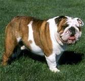 Family:livestock dog, Mountain Dog, Mastiff (Bulldog) Average size of male:Ht: 12-15, Wt: 50 Average size of female:Ht: 12-15, Wt: 40 Bulldog Dogs Available on Petfinder Right Now Despite his sourmug the Bulldog is jovial, comical and amiable, among the most docile and mellow of dogs. He is willing to please, although he retains a stubborn streak. The bulldog is very good with children. Most are moderately friendly toward strangers. The breed is quite good with other pets. The Bulldog appreciates a daily outing but cannot tolerate hot humid weather and should not be expected to jog or walk great distances, or to jump from any heights. Most Bulldogs cannot swim. Most Bulldogs wheeze and snore, and some drool. Coat care is minimal, but facial wrinkles (and any folds around the tail) should be cleaned daily. Major concerns: CHD, KCS, stenotic nares, elongated soft palate, shoulder luxation, internalized tail Minor concerns: entropion, ectropion, distichiasis, CHD, elbow