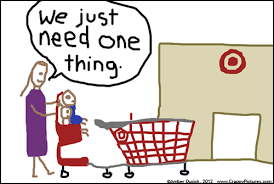 These things are huge. It is a regular cart with an additional two-seater thing bolted on. I think it makes the cart like 34 feet long. I feel so ridiculous trying to maneuver around the aisles that I wind up laughing almost the entire time we are there. So anyway, we arrive and I announce that we just need one little thing. This is to both let the kids know we won't be there long and also as a reminder to myself. But as we walk through the doors, something happens: That is not a bulls-eye. That is a hypnotic-eye. I'm walking back to the car with an overflowing cart. I have no idea what just happened. And I'm pretty sure I forgot to buy the one thing I went in there for. No, Target® didn't pay me to write this. So now they owe me. Make that ice cream breathing dragon thing happen and we'll call it even. Actually don't, that sounds super messy and I don't want it in my house. Also, supporting mom & pop businesses and buying local and buying used is really super awesome and highly superior to shopping at big box stores.