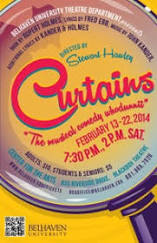 Click on image to view program. February 13-22, 2014 7:30 pm Saturday Matinees February 15 & 22 2:00 pm Blackbox Theatre Directed by faculty member Stewart Hawley Book by Rupert Holmes, Lyrics by Fred Ebb, Music by John Kander, Additional Lyrics by Kander & Holmes, Directed by faculty member Stewart Hawley, Choreography by Dance faculty member Laura Morton Music Direction by Rebecca Geihlser. Music by Kander & Lyrics by Ebb, with additional lyrics by Kander & Holmes. Based on the original book and concept by Peter Stone, the musical is a send-up of backstage murder mystery plots, set in 1959 Boston, Massachusetts and follows the fallout when the supremely untalented star of Robbin' Hood of the Old West is murdered during her opening night curtain call. It is up to Lt. Frank Cioffi, a police detective who moonlights as a musical theater fan to save the show, solve the case, and maybe even find love before the show reopens, without getting killed himself. Director's Notes Curtains is based on the original book and concept by Peter Stone.