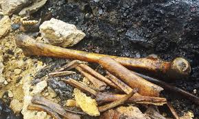 Human bones thought to the Medieval Period have been discovered buried beneath a road.Electrical engineers working for National Grid uncovered the bones while excavating a road in Hertford, Hertfordshire.Initial reports suggested the bones had been found in a bin bag and police established a temporary crime scene around the site. The bones were discovered by engineers from the National Grid who had been digging in a road in Hertford. Archaeologists later confirmed the remains (pictured) date from the medieval periodHowever, archaeologists and forensics experts spent the weekend examining the remains and confirmed they were several hundred years old.It is thought the bones, which included a femur, rib bones, a lower jaw and part of the skull, may have been an ancient burial site. The bones, which included part of a skull, ribs and leg bones (pictured) were studied by archaeologists who said they were hundreds of years oldHowever a black plastic bin bag found with the bones suggest they could also have been moved there.