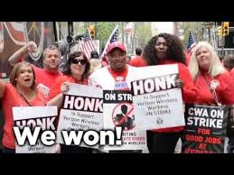 The problem has been corrected and those updates will be entered this Thursday. People should be able to access the TAP on Friday (6/10/16) however reimbursements should cover the period beginning 6-1-16. As you know, the 1st day of the strike was on Wednesday April 13th and members returned to work on Wednesday June 1st on whatever tour they were on the week that the strike began. For the payroll week ending 6-4-16, the Company is going to count any overtime worked on April 10th, 11th and 12th toward the overtime build for week ending June 4th.This would normally be a good thing but the problem is that their payroll system can't figure this out so the calculations are being done manually. Any owed money should be cleared up by next weeks check. (This should be a nightmare) Please follow the link to read the full MOU. CWA District 1 NY/NE Bargaining Report CWA District 1 NY/NE May 29, 2016 39,000 CWA and IBEW members struck Verizon on April 13th because after 10 months at the bargaining table, management had totally refused to address the most important issues for our members.