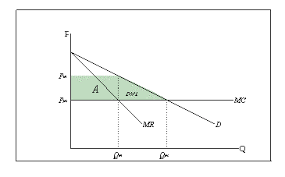 First-degree price discrimination, or perfect discrimination, is the highest level of price discrimination, in which each unit of production is sold at the maximum price that the consumer is willing to pay for that specific unit. The firm will gain the entire market surplus it could possibly achieve, as it will sell all the units for the maximum price at which they could be sold. This degree of price discrimination will always have as a result a Pareto efficient level of output as marginal willingness to pay will be equal to marginal cost. For this reason and even though monopolies are associated with this strategy, the production level of output will be the same as in a competitive market, and hence, the inefficiency associated to monopolies will be eliminated. As seen in the adjacent figure, the producer surplus equals total surplus (A+B). There is not deadweight loss, even though there is not consumer surplus (A, which was extracted by the monopoly), and at the end both quantity and price are equal to those that would result from perfect competition.