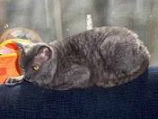 (And we appreciate the break from their near-constant attention!) Devons also REALLY enjoy their indoor life. They are extremely good-natured, affectionate and intelligent. Cats that have significant human contact, especially when young, will strongly bond with one or more of their owners. And Devon's can be devilishly playful, more like puppies than cats, and will even occasionally bring their toys to their owner to signal play-time. These cats can be very athletic, are good jumpers (especially when playing), and love to nestle in nooks, crannies, cardboard boxes, clothes dryers, kitchen cabinets, plastic bags, in fact anything just-cat-sized. They are much less aloof than the typical housecat, will gravitate to your favorite chair and bed, and will often follow their human about the house. As one breeder advised us, "You will never go to the bathroom alone again." They are particularly fond of (some would say insistent at) nestling between one's neck and shoulder. The Devons can also develop a fairly consistent language with their owner, and are well able to make their feelings known.