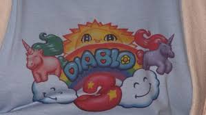 Diablo III Story & Lore Panel Making of "The Black Soulstone" Diablo III beach towel. Mistress of Pain socks. Diablo III Cloissone Pin. Diablo III Barbarian statue. Diablo III Poker Set. Books and Other Media Diablo III stress balls. Diablo III coffee mugs. Diablo pen and paper RPG. BlizzCast: ep 1, ep 2, ep 3, ep 4, ep 5, ep 6 Diablo III Easter EggsBehold The New Diablo III Logo T-Shirt10/11/08 2:20pm I just got out of a brief interview with Diablo III lead designer Jay Wilson, where we discussed a few things about the role of gender in video games and the new rune system in Diablo III, but the whole time I was in there I couldn't take my eyes off of his t-shirt. I've seen it around the convention, but this was my first chance to see it up close. Behold, the new logo for Diablo III. I really dig the ponies.The shirt is of course a direct response to the fans who cried out that Diablo III was too bright and colorful for a Diablo game.