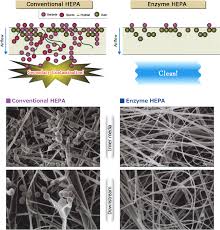 CONTRIBUTION TO THE ENVIRONMENT > The Enzyme Filter eliminates active bacteria propagation, spore growth and contamination found when conventional HEPA or other types of air filters are used. It is an excellent choice for better air quality in enclosed spaces. The image figure below shows the bactericidal mechanism of the Enzyme Filter. The cell walls of the bacteria have been hydrolyzed by the lytic action of the enzyme, and the cell membranes have been ruptured by inner osmotic pressure. Modified lytic enzyme, a natural substance, is immobilized on the filter fibers by the original technology, preventing perfectly secondary contamination without captured bacteria growth. The enzyme does not scatter from the fibers and is not consumed when it dissolves bacteria. Therefore, the enzyme has a very long lifetime. The Enzyme Filter can be used keeping perfect bactericidal ability until it is clogged with dusts. Viruses may be described as particulate matter which contains nucleic acids (DNA or RNA) and some proteins.