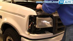 Step 1 - Remove the headlight assemblyRemove bolts holding the assembly. Open the hood and locate the headlight housing. Use a Phillips screwdriver to remove the screw holding the flexible flab to the housing. In case of the F-150, use a 10mm socket wrench to remove the three bolts holding the housing to the truck frame. In the case of the F-250, you will just need to remove the 4 Philips screws (2 on the top and 2 on the bottom) to remove the assembly. Gently pull the housing away from the frame. Step 2 - Remove the headlight bulbRemove the headlight bulb. Locate the headlight bulb on the back of the housing and unplug the wire. Twist the bulb housing to remove it. Some bulbs will require you to press on both sides of its clips to remove. Pull the old bulb out.DO NOT touch the bulb with your fingers. It is best to use latex gloves. Insert the bulb housing back into the headlight housing. Reattach the wiring plug. Gently push the headlight housing back onto the frame.