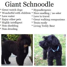 A dog that does not want to herd your animals but keep a watchful eye on them .It is also very nice to have a dog with a soft double coat for protection in the event that they might be in a fight. A non drooling and non shedding dog that can go from barn to in the home at the end of the day is also a plus.I found that the Giant Schnoodle does just as well with my animals as my Pyrenees, and is as watchful of the farm as my Komondors.They are a medium to large breed making the Giant Schnoodle the perfect house dog, but large enough to keep away predators. I quickly learned that the Giant Schnauzer was highly superior in understanding human command in comparison to my other breeds. When I bred the Giant Schnauzer to the standard poodle ( one of the AKC top 5 smartest dog breeds) I was flat out stunned! The body structure is that of a Giant Schnauzer but the brain and the agility of a standard poodle. The Giant Schnoodle is not only growing fast in popularity among farmers, but in the therapy world as well.