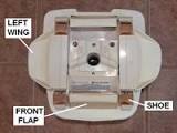 For a larger parts list click here Navigator Part List. Turn the Navigator upside down and remove the plug in the center. The screw will not come out all the way but you should be able to lift it out. Now remove the other four screws. You will have to hold the flaps back to access these screws. Put the screws and plug into the #1 container. Pull the two sections apart. Once apart, they will look like this; the Middle Body on the left; and the Lower Body on the right. Turn the bottom of the Lower Body over and inspect the bearings of the rubber wheels. If they are worn, remove the wheel subassembly and get a new one. Replacement Part # XXXX A Frame Kit. Set this Lower Body aside as we will not be working on it further. Returning to the Middle Body, remove the four screws on the bumper and put them in container #2. Lift off the bumper. We will now divide the Middle Body into its two sections: the Lower Middle Body and the Upper Middle Body. Remove the two screws as shown on the picture and put them in the same container.