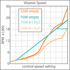 I did not make any measurements of cooling because I couldn’t think of a reasonable way to do it, but I think it is plausible that the updated design cools the motor better.With my speed-measuring setup I can find equivalent loads between different containers. I found that 8 cups of water blended in a narrow container with the 3” blade spins at approximately the same speed as 4 cups of water in the wide 4”-blade container.These measurements show that Vitamix’s specifications are mostly correct, with a maximum blade speed of 28,500 RPM/250 MPH for the 5200 with 3″ blade and 22,700 RPM/270 MPH for the 7500 with 4” blade. Once the motors are significantly loaded (that is, they are blending something substantial) the Classic and Next Generation models deliver the same maximum speeds. The difference is that the microprocessor control of the Next Generation models keeps the blade speed perfectly linear and insensitive to what is being blended, except for when the speed maxes out at high loads and speeds.
