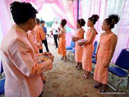 Even if you don’t know any Cambodians when you first arrive, you’ll find that you’re often invited to weddings. Unlike Western weddings, where the guest lists are closely monitored, Cambodians will often invite all and sundry to their weddings, hoping to make the affair as large and impressive as possible. When foreigners are invited to weddings they are usually only invited to certain portions that are meant for an audience, or to the final evening celebration. In the cities, these are often held in large halls or on the street under a canopy. If you’re invited to a Khmer wedding, with your invitation you’ll be given an envelope in which to put the cash gift you’re expected to give the happy couple to help defray the wedding’s enormous cost. Give according to your means; the average gift from a foreigner is around $20, but give more if the bride or groom is your employee or close friend. On entering the reception you may be surprised to find an eagle-eyed mother-in-law manning the reception table, writing down the names of all of the guests and the amount that they’ve given.