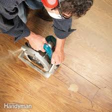 Then remove all the The new plank has a groove at one end and one side, as well as a tongue at the opposite end and side. can’t install it until you cut off the bottom lip of both grooves and the sideUse a utility knife to removeHere’s a tip for cuttingStick the blade inside the groove and cut off the bottom from the inside (or use a table saw). Apply a bead of wood glue to all four edges of the new plank. glued tongue of the new plank into the groove on the existing flooring and drop the plank into place. any excess glue and load books on the plank until it’s dry. Most of the early laminate floors were fastened with glue. But that doesn’t mean you can’t do an "in-place" patch onFollow all the cutting directions shown for a snap-together floor. Then use pliers to break the glueClean off the old glue (Photo 2) and lay in Repair minor damage in laminate flooring Drop a knife or other sharp-edged item and you’ll get an instant chip in your laminate