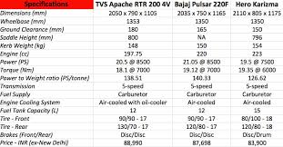 The FI version which produces 21 PS at 8,500 rpm and the same peak torque is not considered in this comparo. The Apache, with the smallest engine in this comparison, is the only model among the trio that gets a four-valve motor, and an oil-cooler. The Pulsar 220F has a slightly better power-to-weight ratio of 140.33 PS/tonne while the RTR 200 has 138.51 PS/tonne and the Karizma has 126.62 PS/tonne.Also Read: TVS Apache RTR 200 4V vs Bajaj Pulsar AS200 vs KTM Duke 200 vs Hero Karizma ZMR vs Yamaha R15The TVS Apache RTR 200 4V is the most expensive motorcycle of the three, priced at INR 88,990. The Hero Karizma is the most affordable model here, priced at INR 83,900. The Bajaj Pulsar 220F is priced at INR 87,698 (ex-showroom, New Delhi).Send Email / SMS Home Profile Products Motorcycles Yamaha Motorcycles Honda Motorcycles Suzuki Motorcycles KTM Motorcycles Bajaj Motorcycles TVS Motocycles Royal Enfield Motorcycles Scooters Yamaha Scooters Honda Scooters Suzuki Scooters TVS ScootersVESPA Scooters 3 Wheelers Bajaj Three Wheelers Piaggio Three Wheelers TVS Three Wheelers Spare Parts Motorcycle Spare Parts Scooter Spare Parts Contact / Enquiry
