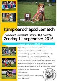 Beste Tollerliefhebbers,Niet vergeten om in te schrijven voor de Kampioenschapsclubmatch. Uiterste sluitingsdatum is 31 augustus 2016. kampioenschapsclubmatch staat bekend om de informele, gezellige sfeer. Ook voor niet-ervaren exposanten is dit een goede gelegenheid om uw hond te laten keuren door een erkende keurmeester.Het is een dag om te genieten van heel veel Tollers bij elkaar, eindeloos ervaringen uit te kunnen wisselen over onze roodharige vriendjes en ondertussen door deskundige keurmeesters uw hond te laten beoordelen. alleen de beste reu en beste teef van de dag, maar ook de beste jeugdhond, de beste veteraan en de Clubwinnaar 2016! de KCM een officiële CAC-show. Het CAC dat wordt toegekend aan de beste reu en de beste teef en telt dubbel voor het Nederlands kampioenschap. Het reserve CAC telt als een vol punt. Aan de beste van het ras wordt de titel Clubwinnaar 2016 toegekend.Tot ziens op 11 september a.s.?