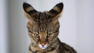 Ears should resemble those of the Serval Cat. Serval Cats have the largest ears of all felines, and largest ears in relationship to head size of any cat. As a result, the Savannah Cat's ears are remarkably large and high on the head. They are wide with a deep base. They should be upright and have rounded tips. The outside base of the ear should start no lower on the head than at the height of the eyes, but may be set higher. The inside base of the ears is set close at the top of the head, ideally vertical parallel lines can be drawn from the inner corner of the eyes up to the inner base of ears. Pronounced ocelli ear markings are desirable.Head should be broad, modified wedge with rounded contuers. The head should be longer than it is wide. The anterior view of the face should present a distinct and symmetric triangular shape. The nose is long with a small chin. It is preferred for the head to have the “l l” marking rather than “M” marking, although this is not in the breed standard.