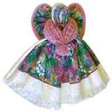 This made a sort of fan for the head and skirt of the angel. We pleated the dishcloth in the same way, wrapping the pleated dishcloth around the angel body bringing the two ends together in the front. We tied a piece of ribbon around the ends to hold them together in front. Then we tucked the open ends back towards the middle inside to make the hands in front of the body. Next we tied ribbon tightly around the middle of the potholder to form wings. Then we slipped one end of the ribbon crimping the potholder in to wings through the back of the angel arms and tied it. A sparkle pipe cleaner can be poked down in the back and brought up and around for her halo and the angel is done. This doesn't require any glue, or sewing, just folding and simple knot tying. I like to use the potholders that have the loop for hanging in the center of one side rather than the corner so that when the wings are attached, it can be used to hang the angel on a kitchen wall for a festive decoration. If you can’t find this kind though, a loop of ribbon can be left at the back to hang her up.