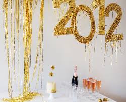 1. Gold fringe wrapped numbers: For the NYE “2012” decor you’ll need: – cardboard (we used some boxes leftover from Christmas gifts) – a tinsel door curtain (available at party supply stores like this one) – glue and scissors – numbers (or letters) printed on paper to desired size. Trace number outlines to cardboard and cut out. The font used on the numbers is called Bebas neue and can be downloaded free here. Then place some glue on the cardboard cut out and wrap a few strips of the foil curtain around it. Continue in this way until the entire cardboard number is covered with foil strips. You can cut off excess strips or simply let them hang off loosely, depending on what look you’re going for. If you like the look we created, make twist the strips a few times while wrapping and attaching them to the number. If you like it more neat, attach the strips evenly. These numbers, although fairly large, are very light-weight and can be hung from the ceiling on nylon string with a bit of tape.