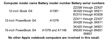 You will receive a link to create a new password via email. Please enter your email address. You will receive a confirmation link.Never miss an update Follow AppleInsider Apple recalls 1.8M iBook and PowerBook G4 batteries The Cupertino, Calif.-based company said it has received nine reports of batteries overheating, including two reports of minor burns. While there have been some reports of minor property damage, Apple said no serious injuries have been reported. The rechargeable lithium-ion batteries include cells manufactured by Sony and were sold with the company's 12-inch iBook G4, 12-inch PowerBook G4 and 15-inch PowerBook G4 notebooks between October 2003 and August 2006. Apple's recall comes just weeks after Dell said it was recalling 4.1 million of its own notebook batteries, which similarly featured cells built by Sony. According to the Consumer Product Safety Commission (CPSC), Apple's recall covers 1.1 million battery packs sold in the United States and some 700,000 additional units sold abroad.