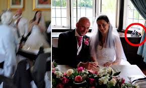 Thomas and Anneka Geary commissioned professional photographers Ian McCloskey and Nikki Carter £750 to cover what should have been the best day of their lives.But they were stunned when the pictures arrived and included out of focus shots of the couple, the back of guests’ heads and a snap of the bride’s mother whose face was completely obscured by her hat. This snap of the couple signing the marriage register appears to feature a ghostly hand clutching a toy motorbike - but it's actually where the snappers tried to edit out Anneka's three-year-old nephew Harry Astonishingly, the photographers even failed to take a single frame of the groom’s parents.One snap of the couple signing the marriage register also appears to feature a ghostly hand clutching a toy motorbike where the snappers tried to edit out Anneka’s three-year-old nephew Harry who was standing in the background.The pictures of the evening do, which hosted 120 guests, were also taken without flash. The couple said almost every shot they received was wrong - including these blurry shots and one the happy couple walking through a doorway with a stack of cardboard boxes in the foreground