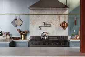 It has a smooth feel and this pleasingly imperfect look.”“We struggled so much to find a paint color that we loved for the cabinets. The kitchen is huge and the light varies, so what looks dark in one place looks bright white in another. It also changes throughout the day: What seems like a nice neutral gray in the morning turns blue at night. And there was the red tone of the floor to deal with, which made so many colors just seem off somehow. And, believe it or not, I’m slightly colorblind which really doesn’t help in situations like this. I’m not exaggerating when I say we tried about 50 colors until finding this one. It’s Porch Swing by Benjamin Moore Aura. It turned out to be a color that couldn’t be ordered, so we had to get the cabinets sprayed, and they came out looking less than perfect. So I hand-painted them all again myself. The things we do for kitchens!” Above: The quartzite reappears as a backsplash. The range is a 48-inch Smeg Opera detailed with a Millennium Pot Filler by Kingston Brass.