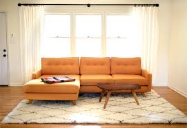 Above: Tara created a laid-back look by layering the room with Moroccan-style rugs from West Elm (the Souk Rug), Wayfair, and Overstock. The circular coffee table is from a nearby antiques shop. Above: “We paneled and stained the walls in the dark half of the living room. It was a huge amount of work, but now it is one of those things that everyone assumes was original to the house–of course, that’s what we wanted, but it also makes us want to yell out “No, we did that! It was yellow before!” They found the nautical flags at Brimfield and furnished much of the room with purchases from Etsy sellers, including vintage leather chairs from Madsen Modern, the circular table from Oh So Mod Vintage–a driver found on Craigslist picked it up for them in Poughkeepsie–and a brass ceiling light by Triple Seven Home. Above: For an offhand touch of color and texture, Tara mixed throw pillows (the fringed one is from Target and the tropical from Wilma Long on Etsy). The sofa is Room & Board’s Reese Curved Sectional and the White Linen Varanasi Curtains were made in India for ABC Carpet & Home.