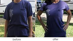 Then I found this great tutorial on YouTube for how to make a big t-shirt a fitted shirt! - T-Shirt Surgery: How to Make a Shirt Fit So, while I was staying with my mom at her camper this summer (she lives & travels in an RV), I asked her to help me try it out. So yes...we broke out the sewing machine next to the campfire. Strange, I know, but it gave us a project to work on! First, a before & after look at the t-shirt we did. Oh yeah, I know you love those electric blue fingernails. So, here's how it's done. Start with a t-shirt you love that's just too big Turn the shirt inside out and lay a shirt that DOES fit you on top of it, lining up the collars so that you can be sure it is centered over your large t-shirt. Trace the shirt that DOES fit you onto the large t-shirt. Turn both shirts inside out so that you don't mark on the front of the shirts. I used a sharpie, but you'd be better off to use a washable marker, chalk or a fabric pen. When you do the sleeves, try to make your line parallel to the top shoulder.
